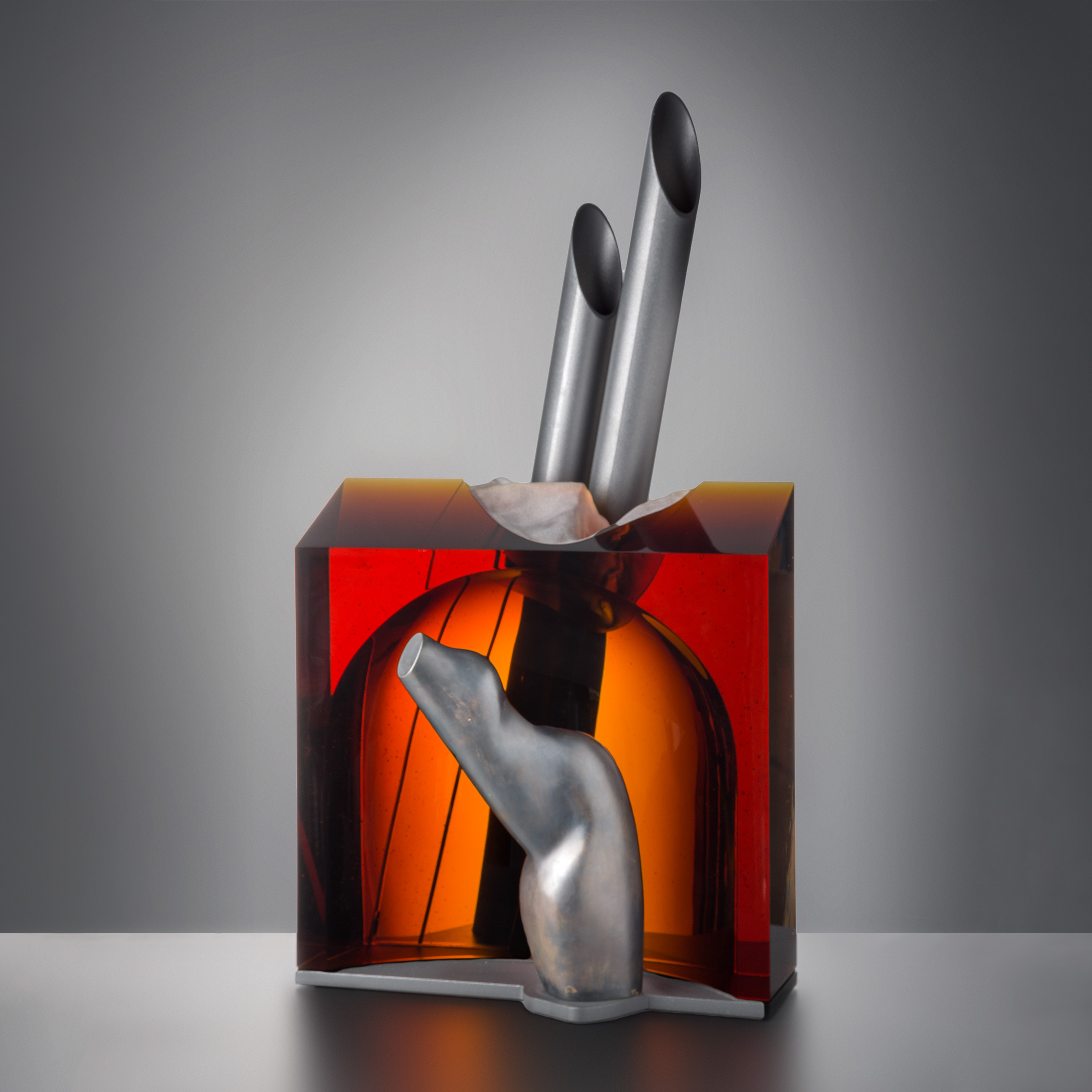 Mold melted glass, cut and polished, metal Note: This sculpture is available in custom colors on commission only.