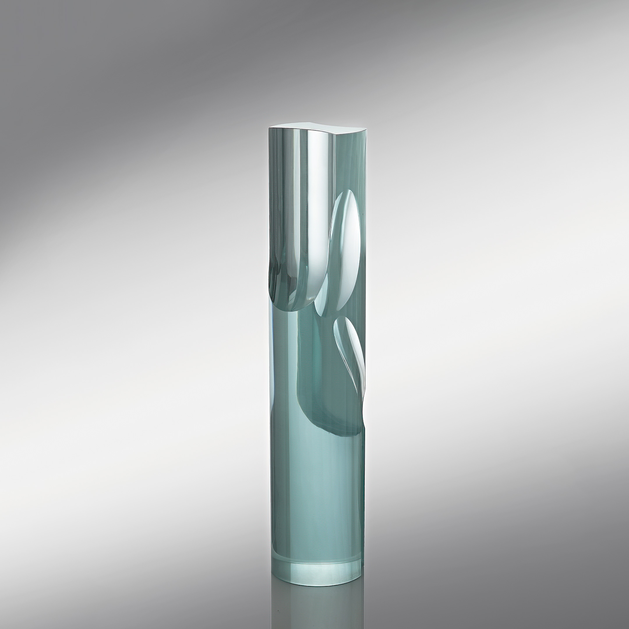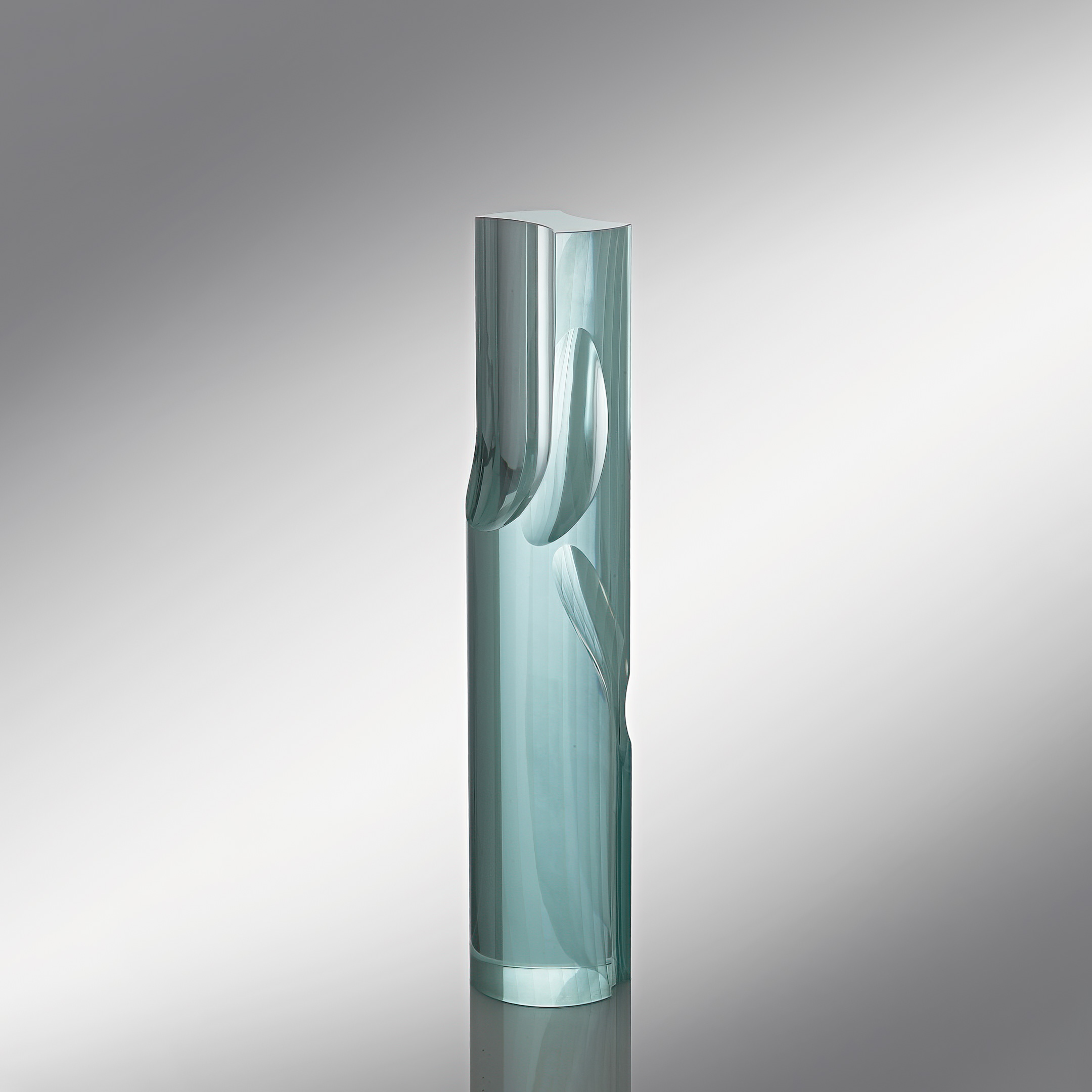 Born 1952 in the Czech RepublicThe work of Jiří Karel focuses on the use of floated optical glass slabs hot-welded in compact blocks that he sculpts and tirelessly polishes until the end composition. Often he uses also firing materials, such as pigments, and metal oxides on the glass plates for painting graphic patterns inside and outside of his sculptures. Then his colorations are first heated and then fused in a compact block. In his sculptures, the artist plays subtly with lighting and reflection and the transparent thickness of the material.